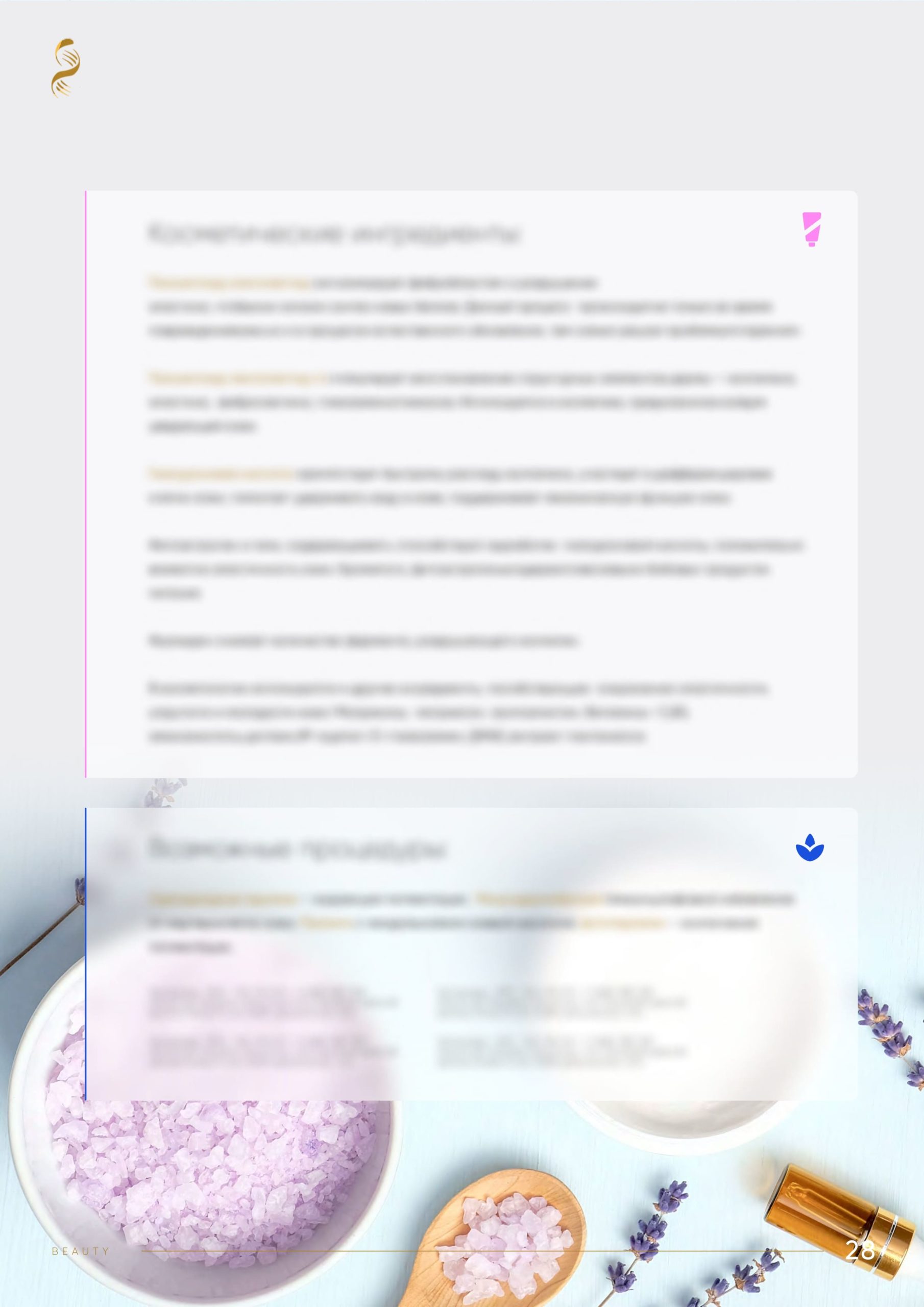 - Рекомендации по косметологическим процедурам (можно ли делать пилинги, какие выбрать филлеры, эффективны ли для вас инъекции гиалуроновой кислоты и мезотерапия).